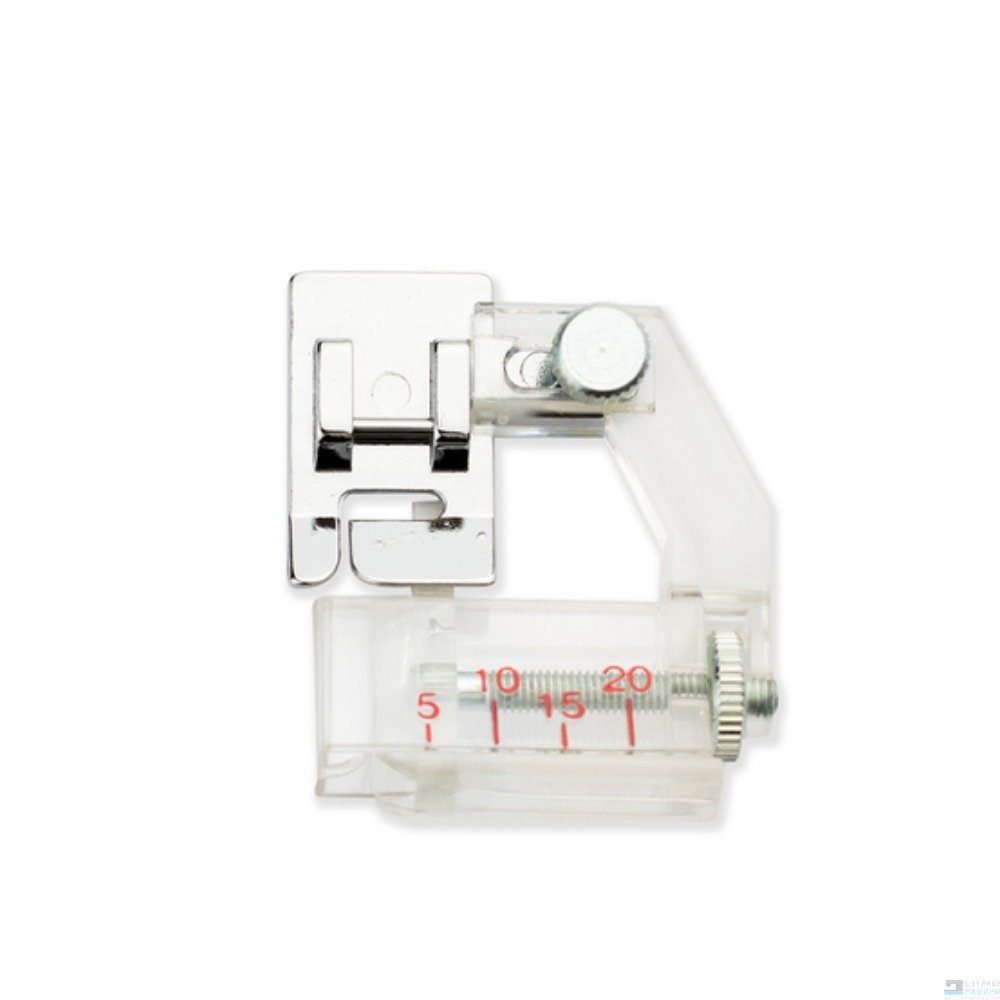 Лапка предназначена для окантовки края ткани косой бейкой шириной от 5 до 20мм. Лапка регулируется колесиком на нужную ширины косой бейки.