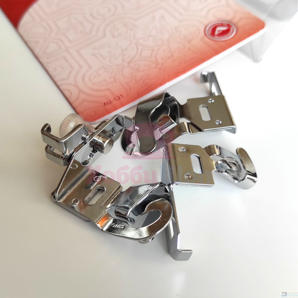 Комплект подрубочных лапок AURORA AU-121 состоит из: адаптера, лапки 6 мм, 16 мм и 22 мм. С помощью этих лапок вы можете легко подрубать кромки на блузках, шёлковых платках или воланах, не производя предварительного заутюживания подогнутых краёв, а также создавать подгибку равной ширины. Такая подрубка кромок предохраняет края ткани от осыпания, при этом образуется ровный и устойчивый край канта.