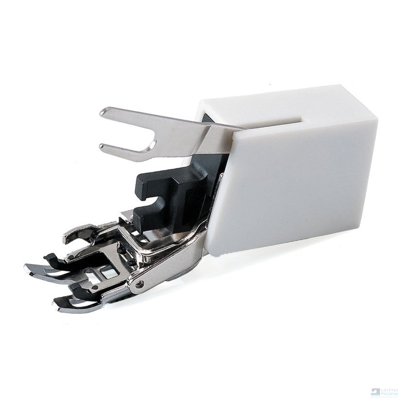 Шагающая лапка, которая представляет собой верхний транспортер. Его принцип работы очень просто - он двигает ткань сверху, т. е. с ним ткань продвигается одновременно и снизу, и сверху, подача ткани идет равномерно и в результате получается не стянутый и не растянутый шов. Для сравнения: при шитье обычной лапкой ткань двигается только нижней рейкой, которая находится на самой машинке.
