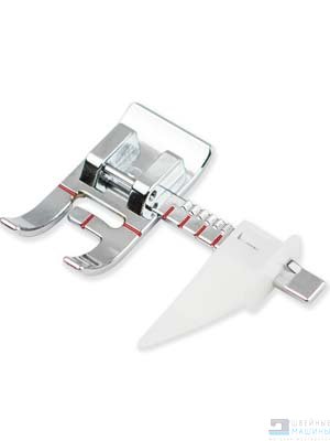 Лапка используется для шитья с отступом от края ткани до 27 мм, а также для выполнения параллельных строчек. Направитель позволяет регулировать и задавать расстояние между строчками.
